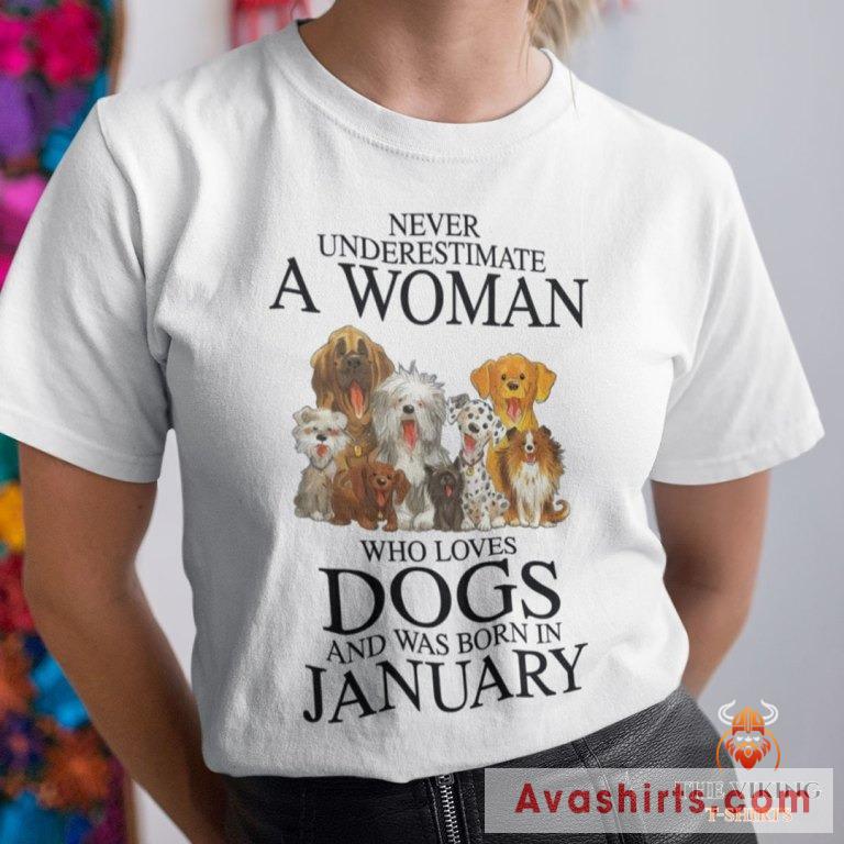 Crafted with quality materials, Never Underestimate Woman Who Loves Dogs Born In January Shirt is designed to be both durable and cozy, perfect for everyday wear. It probably comes in a range of sizes to ensure a flattering fit for all body types, and perhaps offers different color options to cater to diverse style preferences.