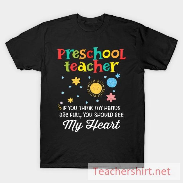 The design of the T-shirt features a cute heart illustration, symbolizing love and appreciation, along with the phrase “Preschool Teacher” or “Preschool Teacher Appreciation.” The design may also include additional elements such as playful illustrations of children, educational symbols, or inspiring quotes to further convey the admiration and gratitude.